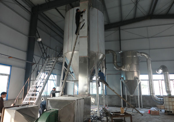 空氣經(jīng)過(guò)濾和加熱,進(jìn)入干燥器頂部空氣分配器,熱空氣呈螺旋狀均勻地進(jìn)入干燥室。料液經(jīng)塔體頂部的高速離心霧化器,(旋轉(zhuǎn))噴霧成極細(xì)微的霧狀液珠,與熱空氣并流接觸在極短的時(shí)間內(nèi)可干燥為成品。成品連續(xù)地由干燥塔底部和旋風(fēng)分離器中輸出,廢氣由風(fēng)機(jī)排空。